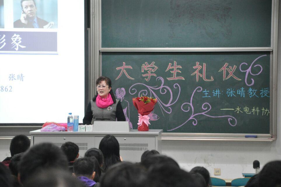 礼仪队顾问。张晴老师为14级全体新生讲授了大学生的基本礼仪规范。