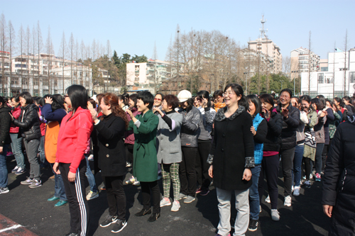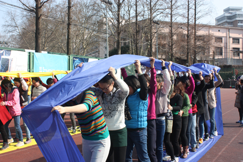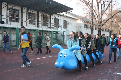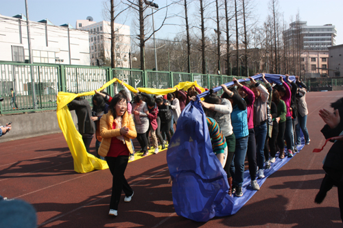 昨天在操场上,学院女教工来的还真不少,借着温暖的阳光和拓展训练教练的感召力,大家脸上洋溢着美丽、年轻的笑容。