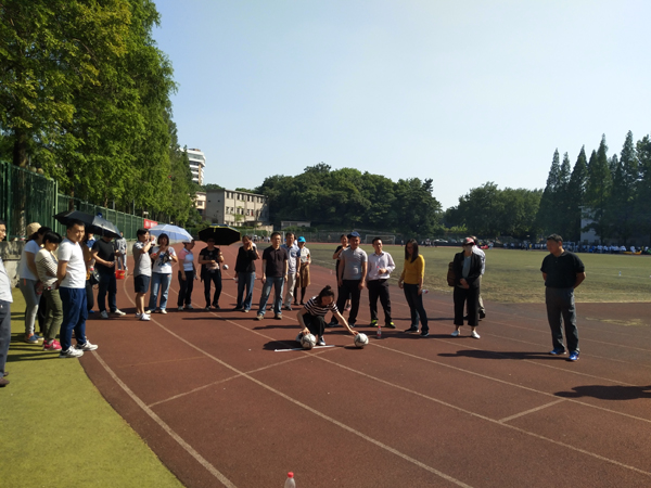5月8日下午一个骄阳似火的日子,校工会的趣味运动会在操场举行,火辣辣的太阳,挡不住参加趣味运动会老师们的热情,投沙袋、跳绳、踢足球都那么激情又认真,虽然一些男老师跳绳的技艺差了点,但丝毫没有影响比赛,我们依旧跳出了105的好成绩,最后一项关键的骑毛毛虫奔跑比赛,缺少男教工也没难道我们,女教工上,帅小伙带着4位女美女一样跑出好成绩,最终我们获得了一等奖的好成绩。(供稿人:陶艳芝)