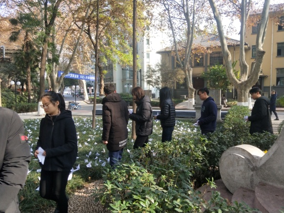 中午十二点半,本科生第一党支部的全体党员身着素装在水电馆329会议室集合,集体学习南京大屠杀的历史、高唱国歌,并由党员代表赵科皓和王慧动情朗诵“南京,我的南京”。朗诵结束后,全体党员亲手制作白色千纸鹤。随后,全体人员前往校内南京大屠杀死难者清凉山丛葬地“侵华日军南京大屠杀清凉山遇难同胞纪念碑”前手捧千纸鹤默哀一分钟,沉痛悼念和缅怀逝去的同胞,默哀毕,缓步绕纪念碑一周并在草坪中虔诚的放下千纸鹤以寄托哀思。活动的最后,全体党员再次回到水电馆329在肃穆的氛围中分享今日感悟,参加活动的学生纷纷表示,公祭日活动不仅让我们以尊崇之心珍视和平,以民族之力失志复兴,而且也激励青年人勿忘少年强则中国强的自勉道理,为实现中华民族伟大复兴而不懈奋斗。