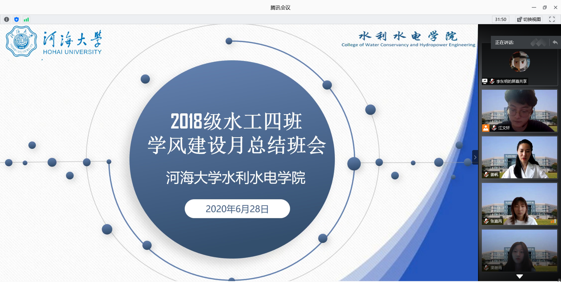 根据学校开展领导干部结对联系学生工作的相关要求和学院整体安排,6月28日下午,水电院2018级水工四班举办“隔空不隔爱,停课不停学”学风建设线上主题班会。av漫画 副校长郑金海、水电院党委副书记王方、2018级水工四班全体同学参加班会。2018级本科生辅导员姜帆主持班会。