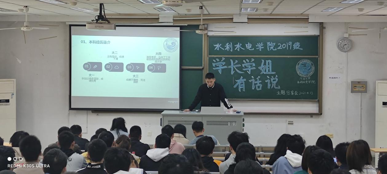 2021年4月13日下午,av漫画 2019级本科生举办了“学长学姐有话说”学风建设主题分享会,邀请2017级优秀的学长学姐温家宣、闫致远、李柯雅分享学习经验、发展路径,2019级全体同学参与,辅导员帅雨婷出席。