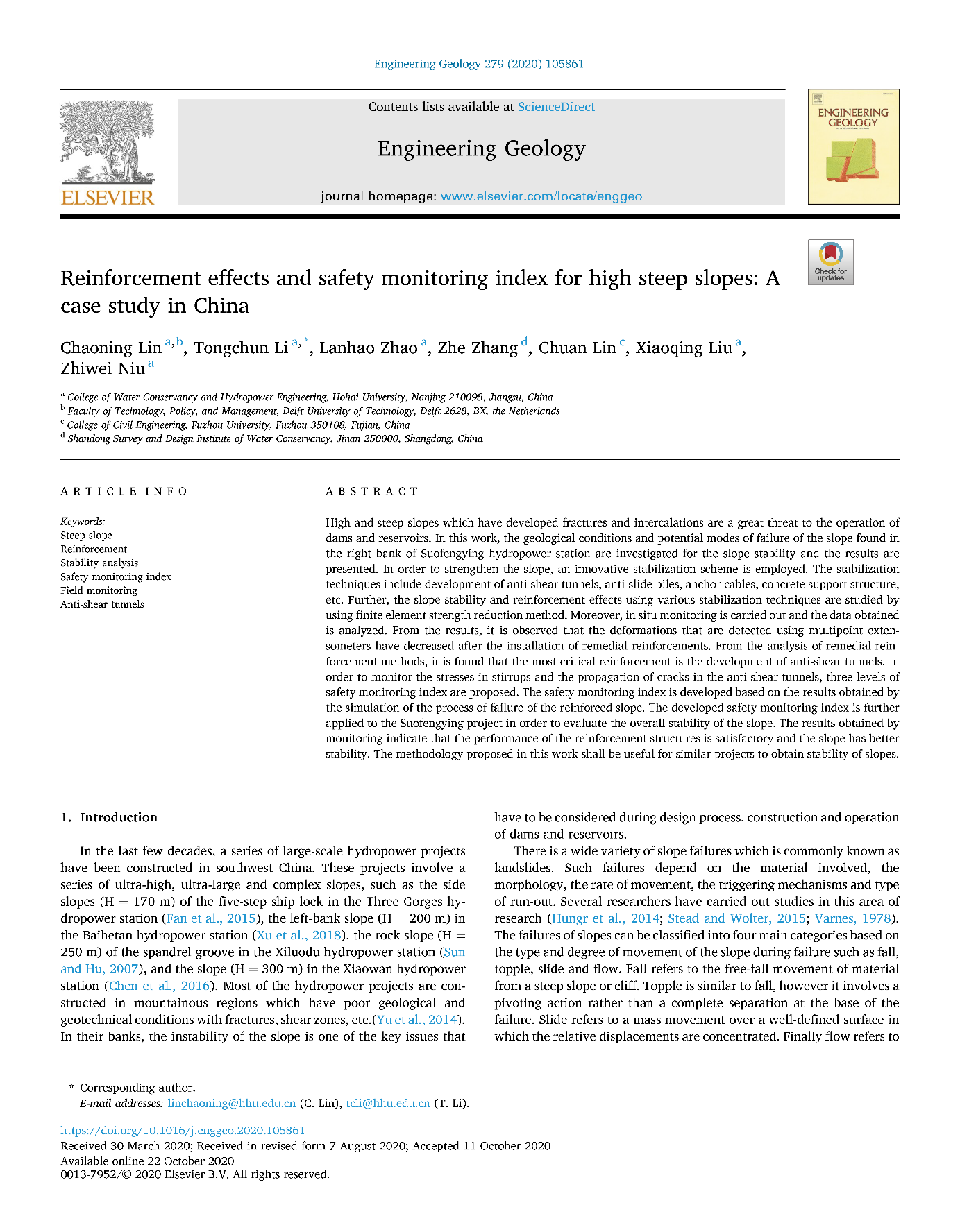 近日,av漫画 李同春教授研究团队在岩土工程类权威期刊《Engineering Geology》(av漫画 A类期刊,中信所1区,影响因子4.779)上发表题为:“Reinforcement effects and safety monitoring index for high steep slopes: A case study in China”的研究论文。