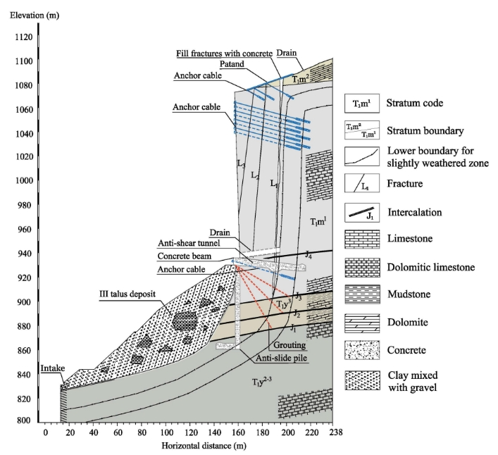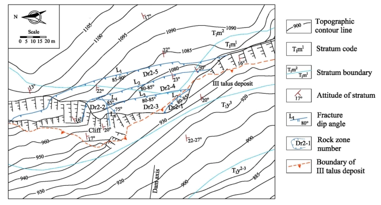 库岸边坡稳定问题是水利水电工程地质研究的热点问题。某水电站Dr2危岩体位于坝址右坝肩上方的灰岩陡崖上,距右坝肩最近水平距离140 m ,分布高程900 ~ 1 085 m(图1、图2)。该危岩体规模巨大,地质条件复杂,且距大坝进水口等主要水工建筑物近,其失稳会对相邻的主要水工建筑物造成严重的影响。本研究针对索风营水电站Dr2危岩体的工程实际,分析了各项加固措施对危岩体抗滑稳定安全性的贡献度,以及加固后Dr2危岩体的整体安全度。对于危岩体加固工程,由于其加固措施的作用,危岩体发生失稳破坏之前势必会先造成加固构件的破坏。因此,本研究从结构分析方法出发,模拟了加固后边坡的渐进破坏过程,提出了通过判断各锚固洞的工作状态来评判危岩体稳定安全状态的方法,据此建立了以锚固洞钢筋应力、裂缝开度等监测量为依据的三级监控指标。研究成果为该工程的安全运行提供了重要依据,可供类似工程借鉴。