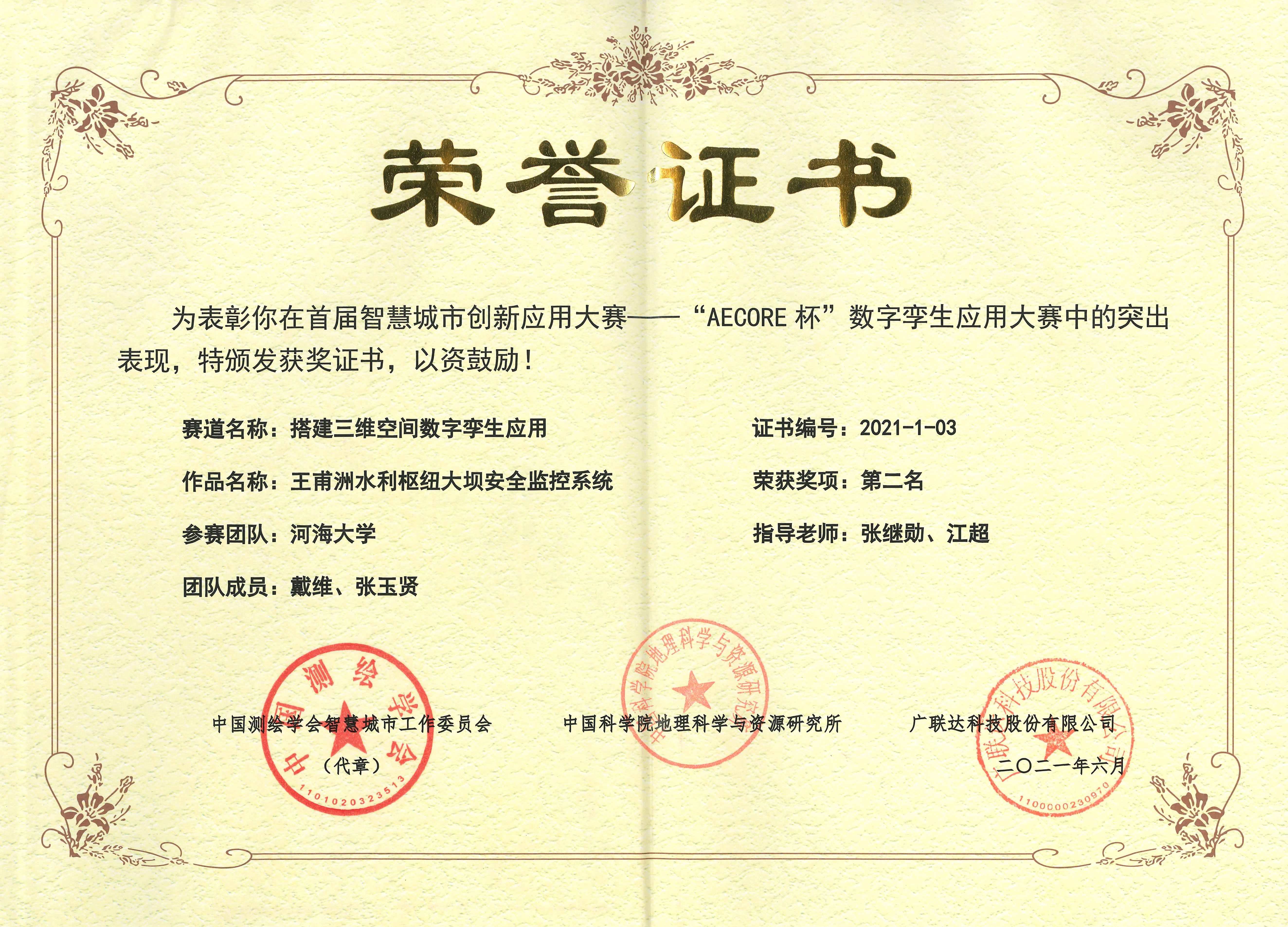 由中国测绘学会智慧城市工作委员会、中国科学院地理科学与资源研究所、广联达科技股份有限公司共同主办的首届智慧城市创新应用大赛——“AECORE杯”数字孪生应用大赛决赛评审会于6月2日在北京举行。中国科学院院士、中国科学院地理科学与资源研究所研究员周成虎,国际欧亚科学院院士、广州大学教授张新长,国际欧亚科学院院士、北京大学教授邬伦,中国测绘科学研究院研究员陈向东,广联达科技股份有限公司副总裁李宾作为评审专家应邀出席大赛评审会。大赛共收到了清华大学、北京建筑大学、av漫画 、上海交通大学、雄安市民服务中心、浙江浙大中控信息技术有限公司等高校和企业的60余支队伍提交的作品。av漫画 硕士研究生戴维、张玉贤组成的SimpleDam团队提交的作品“王甫洲水利枢纽大坝安全监控系统”最终荣获第二名的好成绩。