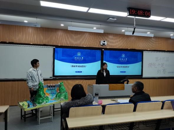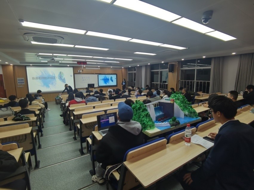 参赛选手按照抽选顺序依次上台答辩,展示团队精心制作的大坝模型,详细讲述大坝的设计背景、制作过程、工作原理及创新点。有的作品考虑雾化问题,巧设装置消减泄洪雾化;有的作品为了能源最大化利用,创新性地设计光伏板坝体;有的作品对消能问题深入研究,巧用二冲孔消能;还有作品注重发展旅游业,在大坝景观上深下工夫。部分作品还在现场进行了三维模型动画展示,令评委和现场观众眼前一亮。