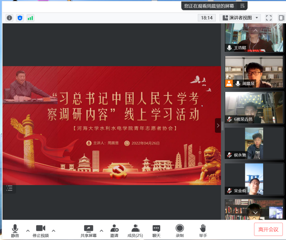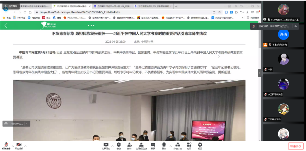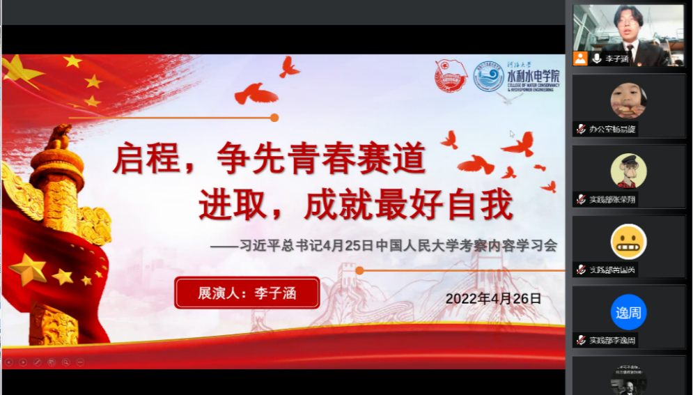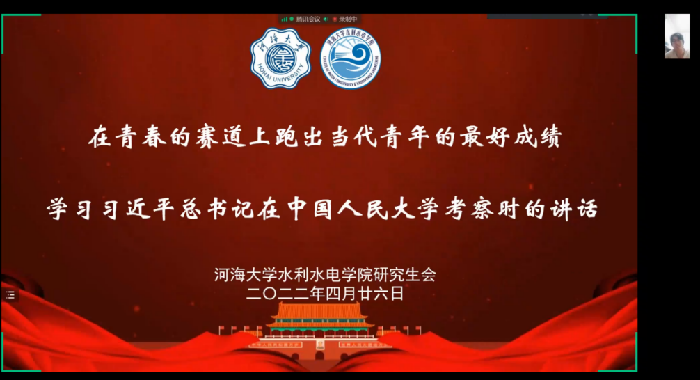 院研究生会于4月26日晚以腾讯会议的形式举行了专题学习交流会。通过播放习近平总书记在中国人民大学考察时的新闻视频,结合av漫画 水利工程的一流学科特色进行了进一步的分享和交流。从新民主主义革命时期的张闻天精神,到新中国建立后的兴修水利,一代又一代的河海青年都在自己的岗位上发光发热。