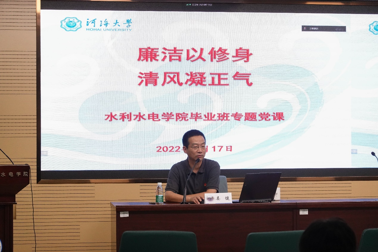 6月17日,院党委书记娄健以《廉洁以修身,清风凝气》为题,为全体2022届毕业生党员讲授廉政专题党课。党课院党委副书记王方主持全体毕业生党员在水电馆301会议室和腾讯会议线上线下同时参加学习。