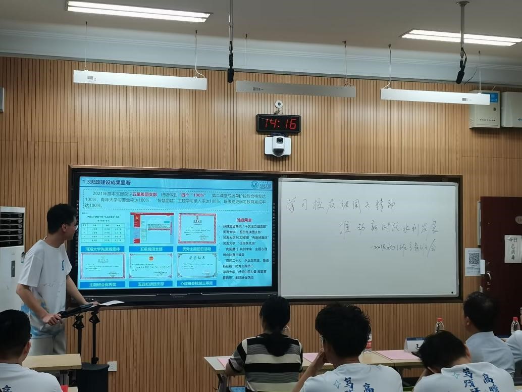 班长万扬围绕思想引领、学风建设、班级制度、特色活动、学生典型、获奖成果等方面就班集体建设的具体情况进行了详细的介绍,着重对班级的特色活动开展和学风建设情况进行展示和交流。