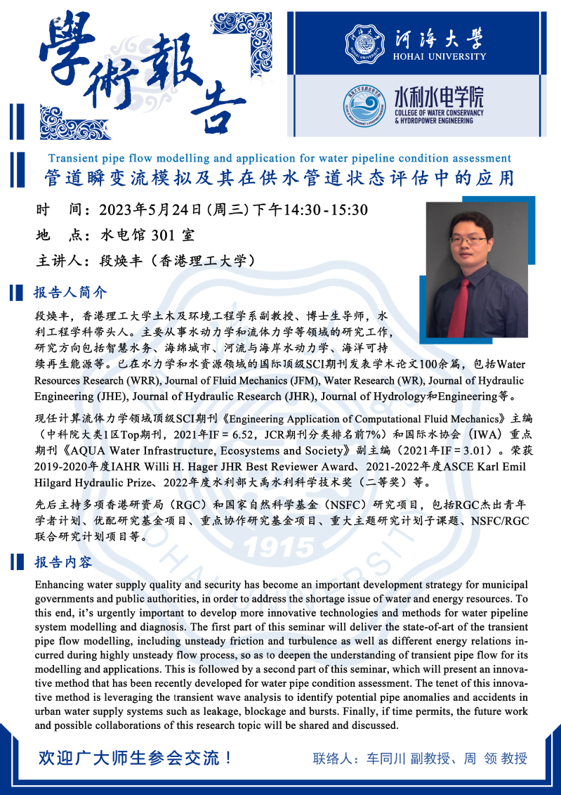 学术报告会 | 管道瞬变流模拟及其在供水管道状态评估中的应用