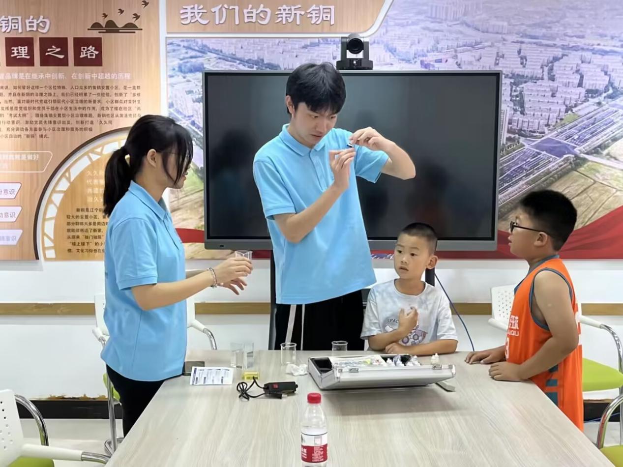 在实践地,实践团结合PPT授课,分别从长江植物、长江动物、长江人文、水体污染及应对措施等方面,向社区儿童进行了知识科普讲解,让社区儿童对长江知识有了进一步的了解。实践团成员现场展示水质检测、电解水等实验,精心设计长江小故事接龙、长江动物绘画、苔藓微景模型制作等小游戏,在保证趣味性和科学性的基础下,指导孩子们有序完成。