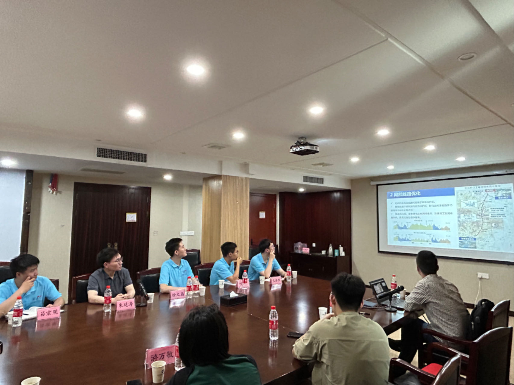 引江补汉工程将南水北调工程与三峡工程两大“国之重器”紧密相连,是南水北调后续工程首个开工项目,也是我国在建综合难度最大的长距离引调水隧洞。通过引调水院副院长游万敏的介绍,博士团从工程布局布线的优化设计、不良地质条件的应对措施等方面了解到引江补汉工程的设计和施工难点,并围绕大埋深长隧洞复杂地质问题处理技术、校企联合人才培养方式进行了讨论。