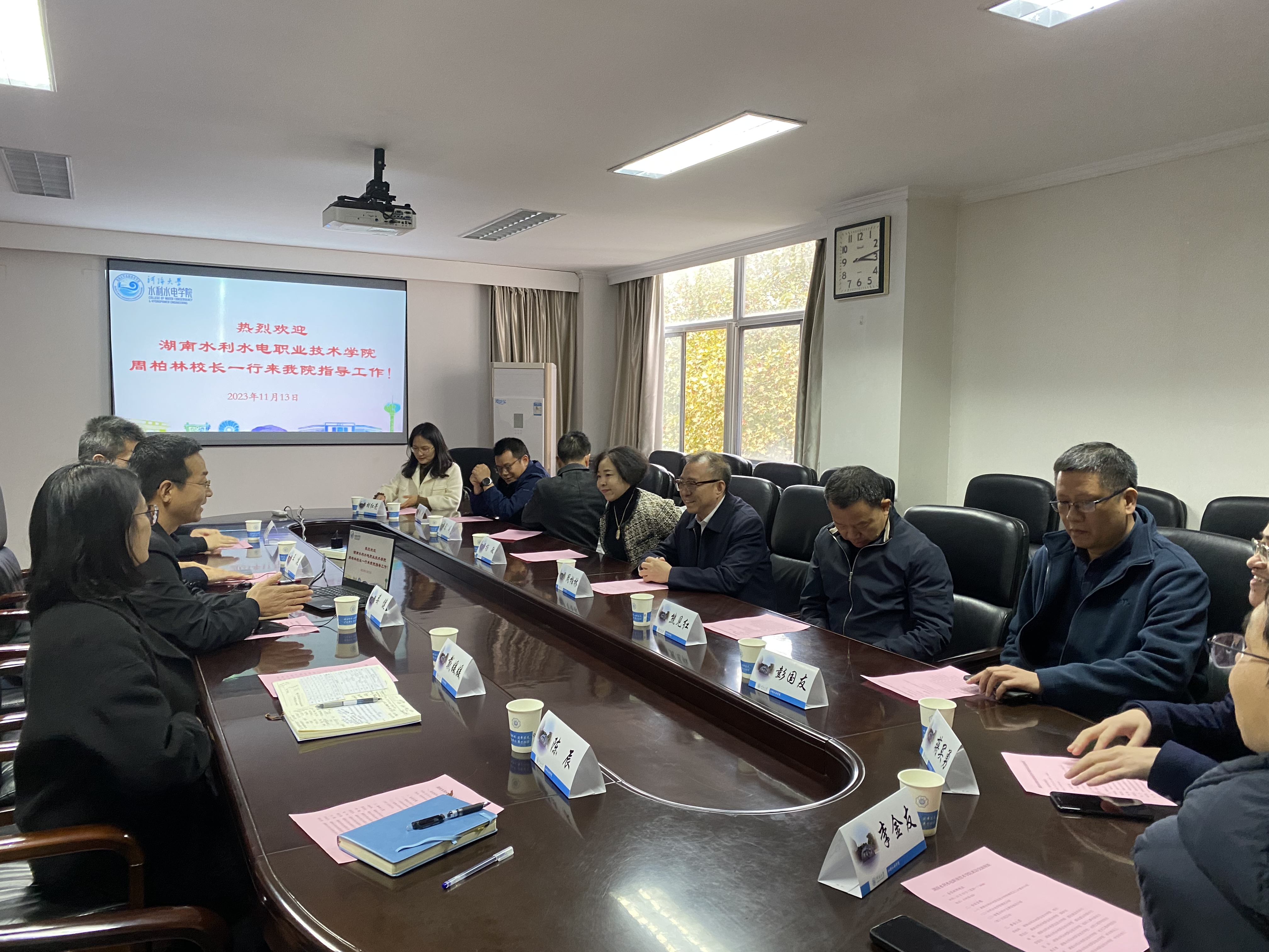 娄健对周柏林一行来访表示诚挚欢迎,并介绍了学院发展沿革、学科建设、师资队伍等情况。俞晓东就学院智慧水利专业建设相关情况进行了详细介绍。周柏林介绍了湖南水利水电职业技术学院基本情况及人才需求情况,希望未来双方在专业建设、新教师引进、教学管理等方面加强交流合作。