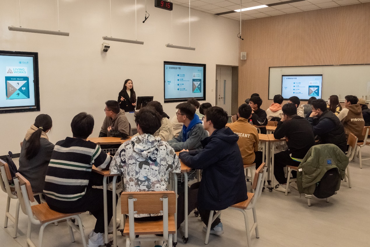 姜帆老师为同学们引入TASC(察觉、询问、陈述、链接)模型,指出作为心理委员应该如何识别和初步干预心理危机,用科学的方法引导同学走出心理误区,在心理危机预警机制中发挥应有的作用。