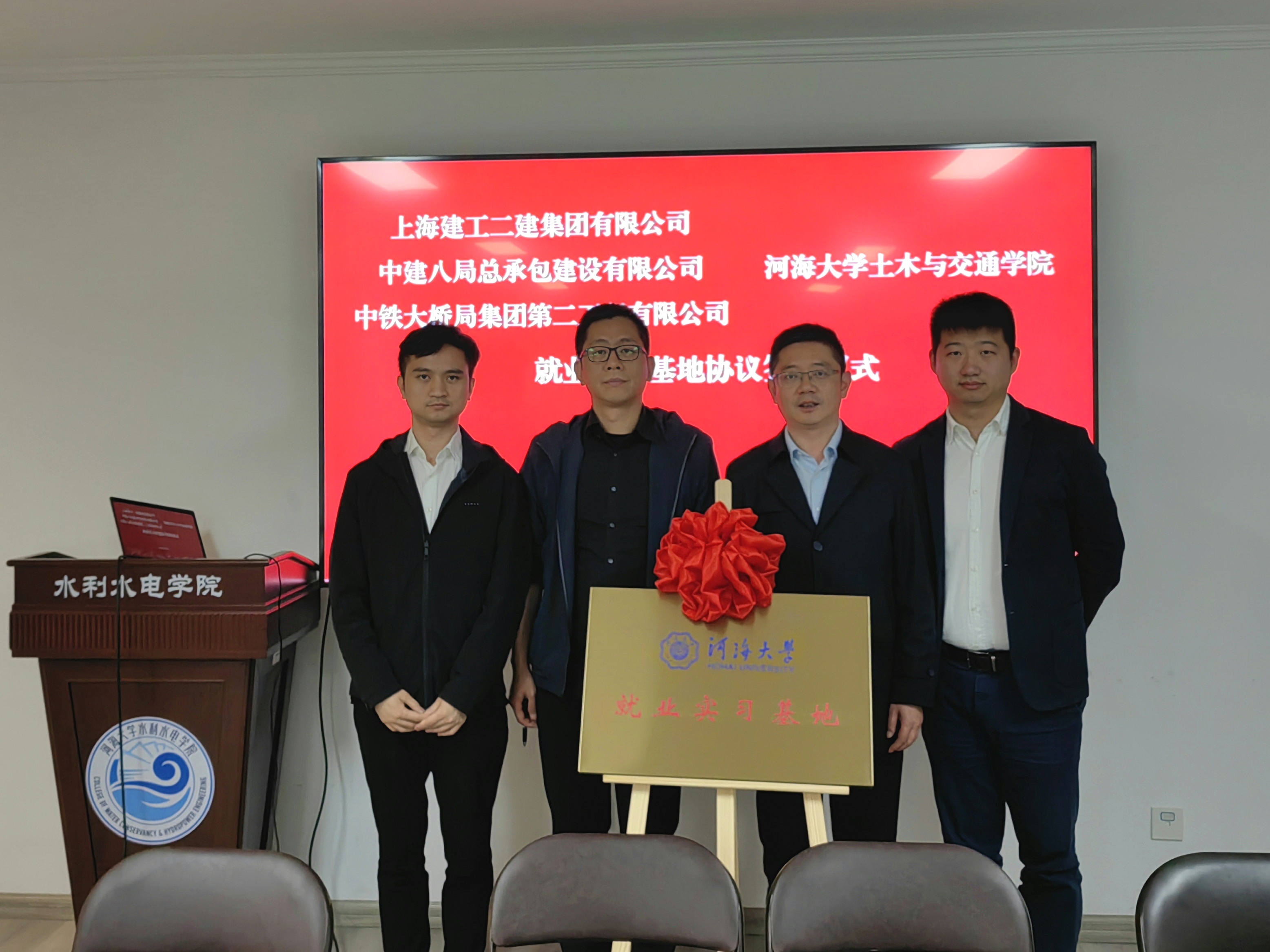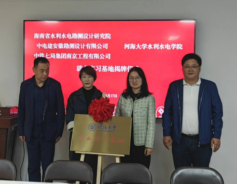 在与会人员的共同见证下,水电院与海南省水利水电勘测设计研究院有限公司、中电建安徽勘测设计有限公司、中铁七局集团南京工程有限公司,土木院与中铁大桥局二公司、中建八局总承包公司江苏分公司、上海建工二建集团共同签订了合作协议并为“就业实习基地”揭牌。