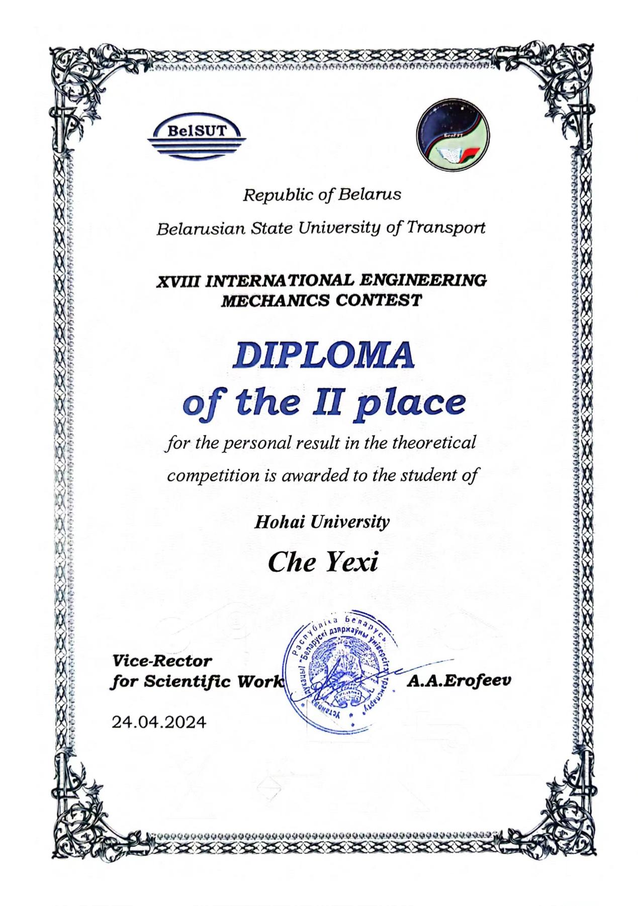 2021级本科生车烨晰同学参加了第十八届国际大学生工程力学竞赛,斩获个人赛银牌1枚。该赛事在白俄罗斯戈梅尔的白俄罗斯国立交通大学举行,来自中国、俄罗斯、白俄罗斯等多个国家共20余所高校100余位师生代表参加竞赛。据了解,去年12月车烨晰通过由av漫画