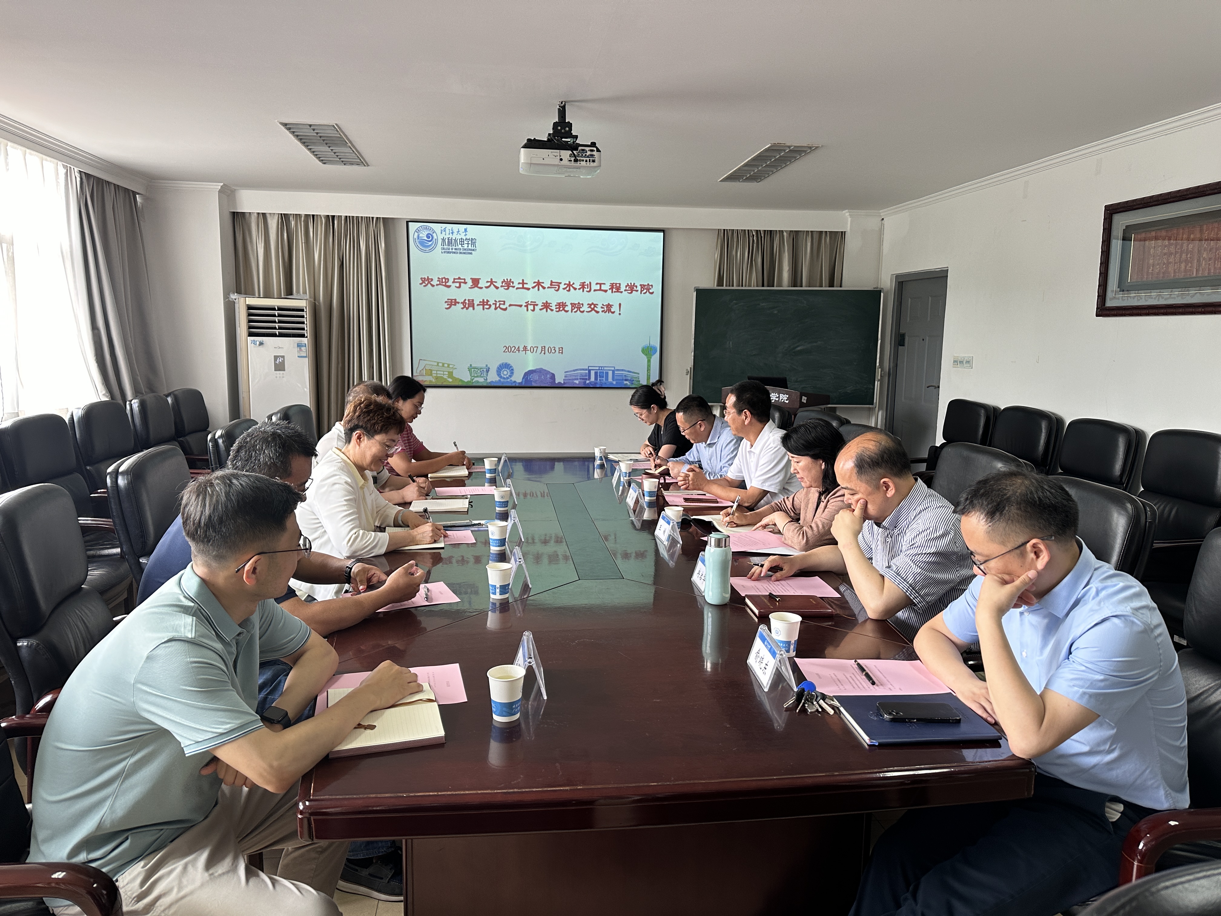 7月3日,宁夏大学土木与水利工程学院尹娟书记一行来av漫画 调研。学院党委书记娄健,院长王媛、副院长冉启华、副院长赵兰浩、副院长俞晓东、党委副书记戴媛媛参加本次座谈会。