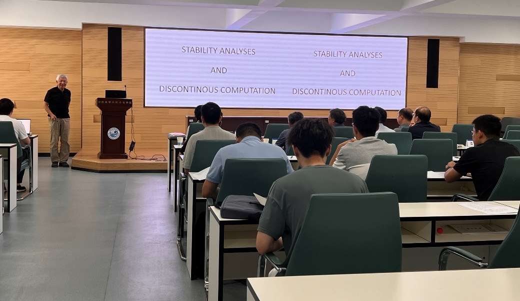 首都师范大学李克正教授应邀做了题为“流形上的微分方程”的主题报告。报告首先介绍了常微分方程解的唯一性,然后深入浅出的介绍了数学中的“流形”概念,并对切空间和向量场进行了解释。在此基础上推导了流形上的自治微分方程和流形上微分方程的整体解,从而对时空大范围上的微分方程给出了基于流形的数学刻画,最后以一个刚体动力学的例子进行举例应用。