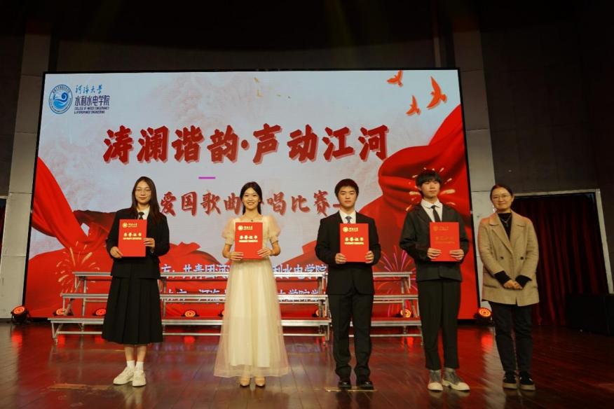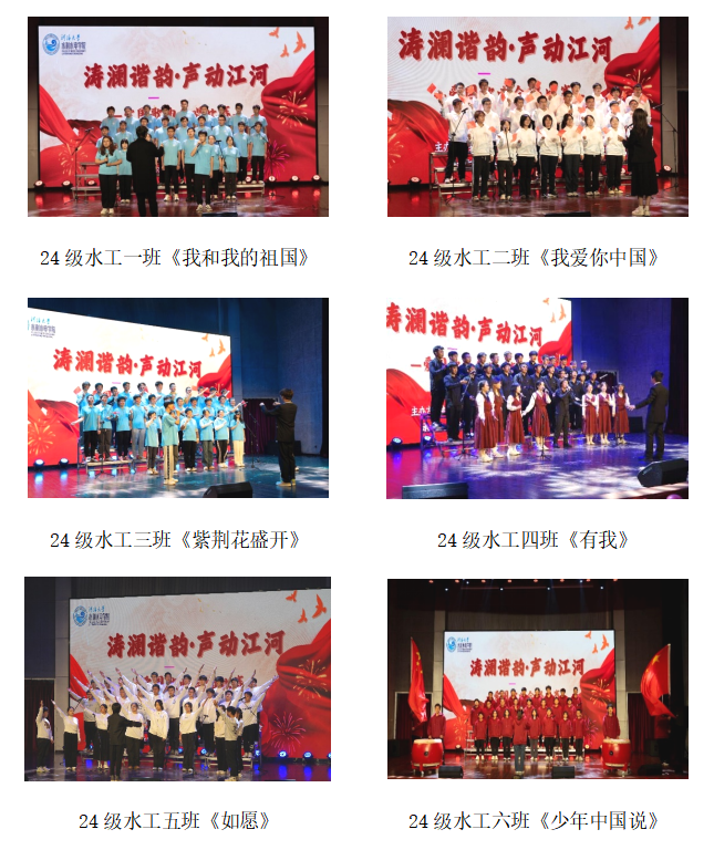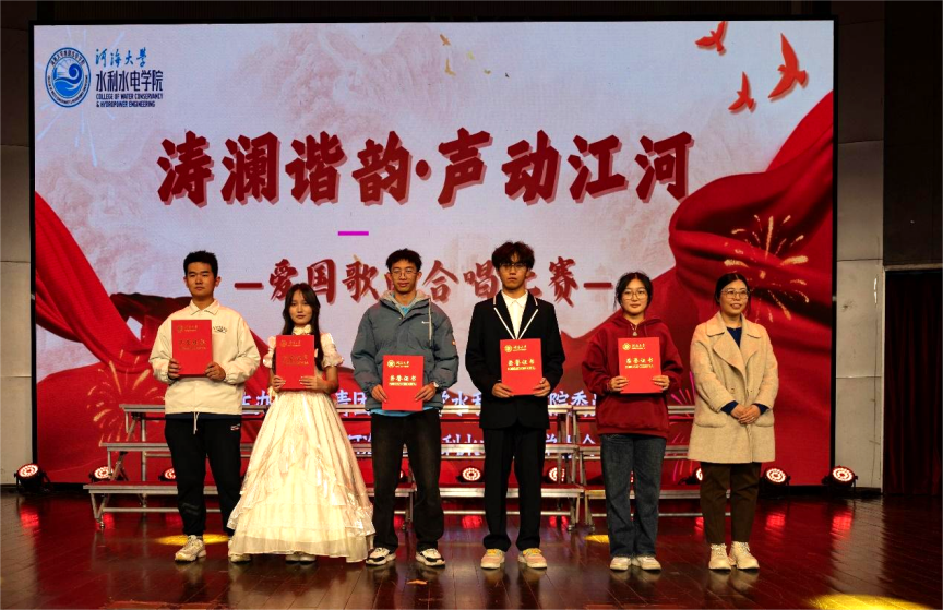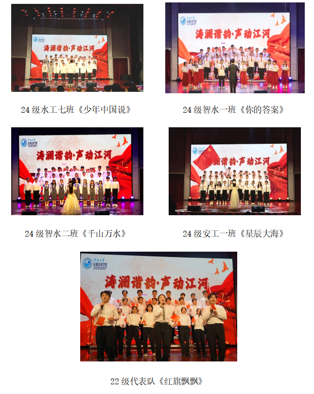 比赛现场掌声雷动,选手表现精彩纷呈。优美的旋律,动听的歌喉,无不诠释着水之子们的拳拳爱国之心,无不展示着新一代爱国爱党的思想觉悟。经过激烈的角逐,最终22级代表队和24级智水一班获得一等奖,24级水工五班、水工四班、安工一班、水工二班获得二等奖,24级水工六班、水工三班、水工一班、智水二班、水工七班获得三等奖。