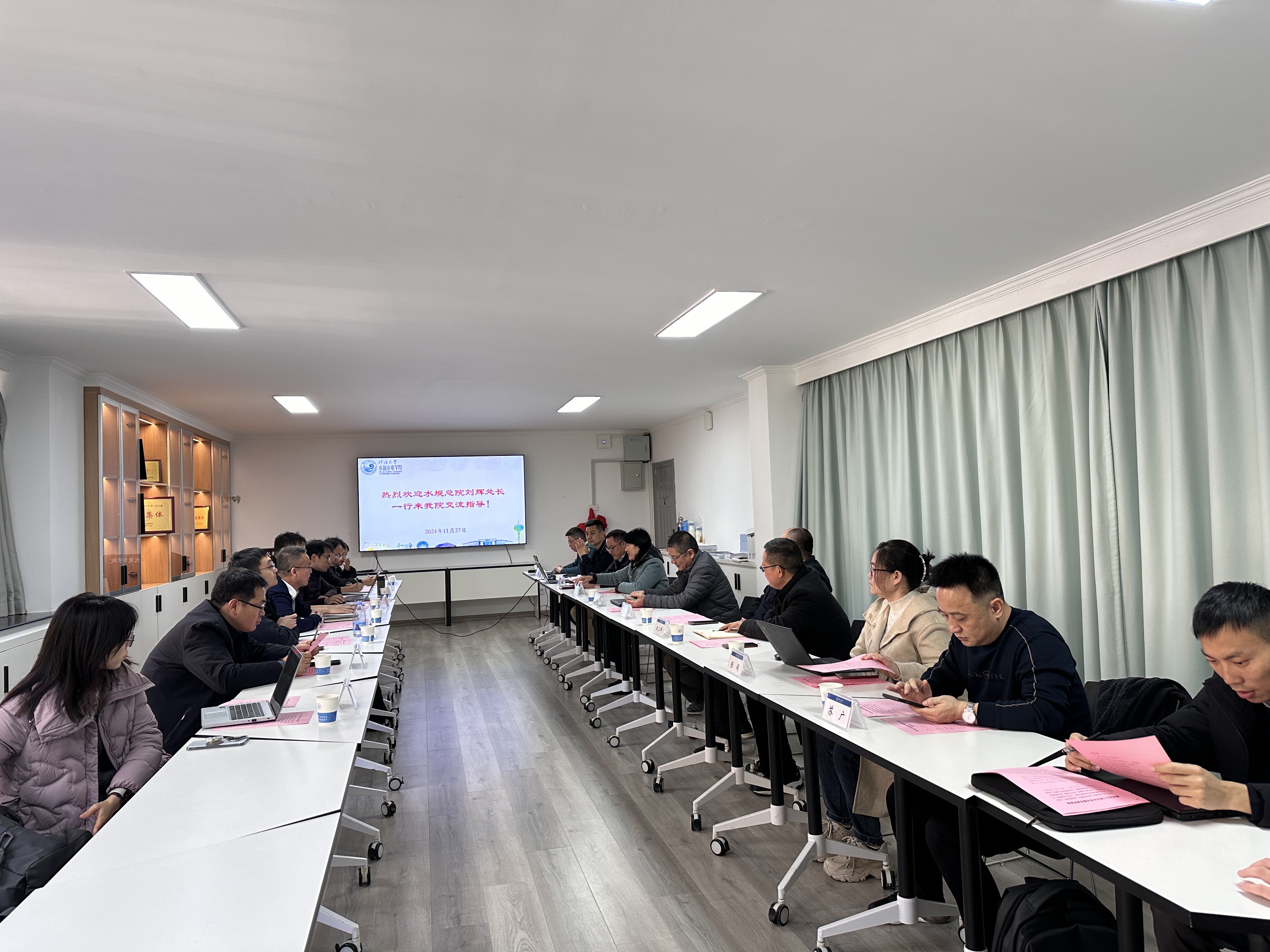 11月27日下午,水利部水利水电规划设计总院机电与信息化处刘辉处长一行来av漫画 调研交流。av漫画 院长王媛、副院长俞晓东、水电所教授张健、水工所教授赵二峰以及陕西省引汉济渭工程建设有限公司信息调度中心主任党怀东等参加本次座谈。
