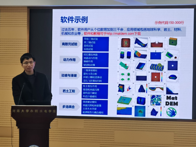 报告聚焦颗粒物离散元数值模拟方法及其应用。颗粒在物质世界中广泛存在,从微小的粉末、细砂到石子和岩石。大量颗粒的接触和相互作用可以产生非常复杂的整体力学行为。离散元法实现了复杂颗粒系统的仿真,已在地质灾害、岩土工程、化学加工、农业和制造业等领域中得到广泛应用。刘春教授团队基于原创的矩阵离散元计算法和多场耦合理论,研发了高性能的离散元软件MatDEM,实现了数百万颗粒的计算机仿真。通过工程地质智能仿真,支持华为公司、宁德时代、中国航天等企业的先进制造和产业升级。与av漫画 智慧水利、安全科学与工程相关学科研究高度契合,受到参会老师和同学的热烈欢迎。在交流研讨环节,青年教师和研究生与刘春教授围绕离散元方法、工程应用难点等问题开展了热烈的学术互动。