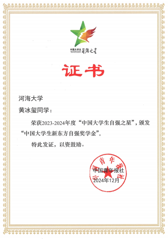 近日,由共青团中央、全国学联指导,团中央基层建设部、中国青年报社主办的“中国大学生自强之星”评选活动落下帷幕,av漫画 水力学及河流动力学专业2024级博士生黄冰玺荣获“中国大学生自强之星”荣誉称号。