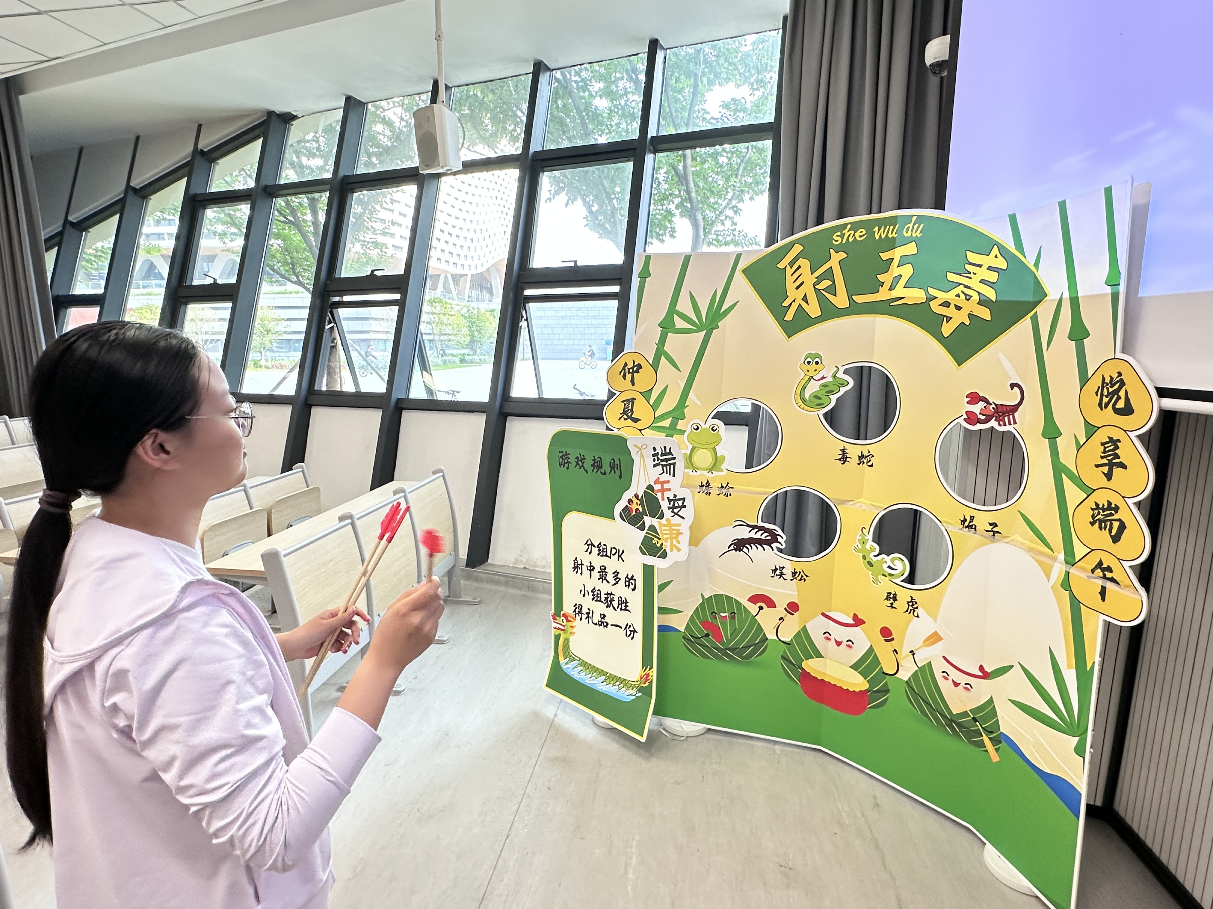 投壶去百病,矢箭射五毒。现场同学按照分组轮流参加投壶和射五毒小游戏,箭矢划过空气,现场鼓掌声、欢呼声此起彼伏。游戏结束后,同学们根据游戏结果领取粽子挂件、艾草香包等小奖品。