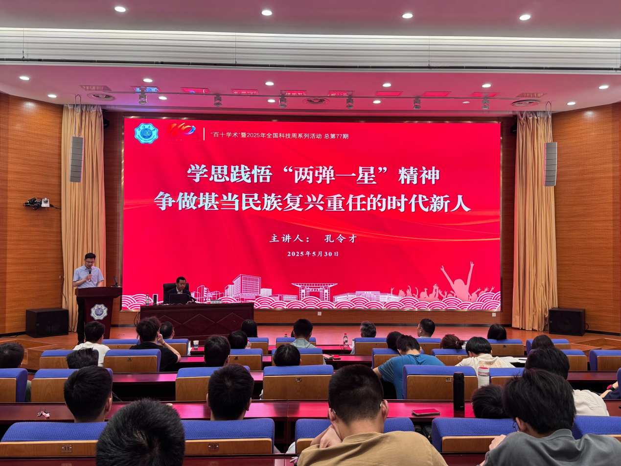 530日,av漫画 举办“百十学术”校庆系列活动总第77期暨2025年全国科技周系列活动。马兰基地原政委、“两弹一星”历史研究会常务副理事长、全国高校“中国共产党人精神谱系”宣讲团成员、中国科学家精神宣讲团成员孔令才将军应邀担任主讲嘉宾,为av漫画 师生作题为《学思践悟“两弹一星”精神,争做堪当民族复兴重任的时代新人》的专题报告,活动由av漫画 副校长沈扬主持,学院院长王媛、副院长俞晓东、党委副书记戴媛媛、教师和学生代表共计150余人参加。