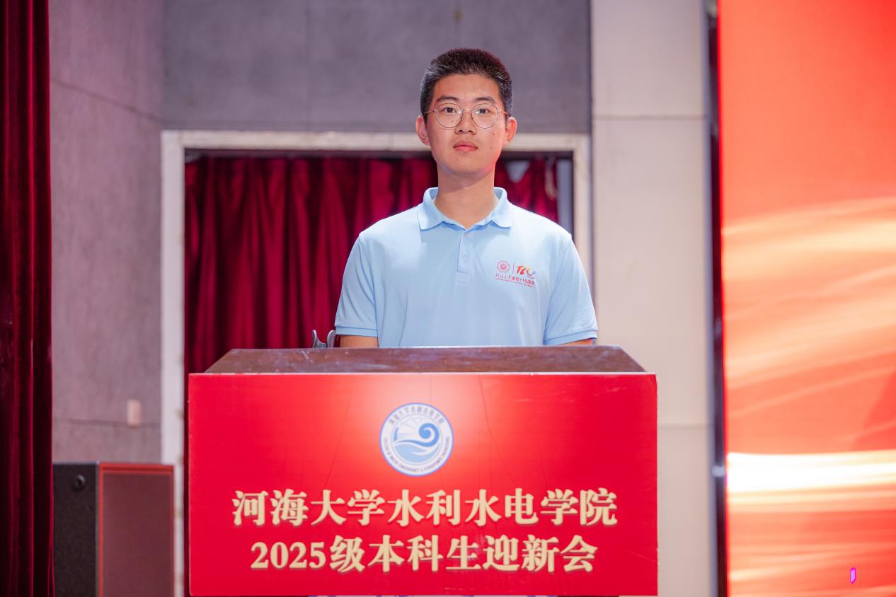 新生代表2025级水利水电工程专业李彦德同学代表全体新生发言,讲述了自己选择河海的历程,围绕大学规划,表达了对未来校园生活的展望。作为建校110周年之际的新生,他表示将与师生共同努力,为av漫画 再谱新章。