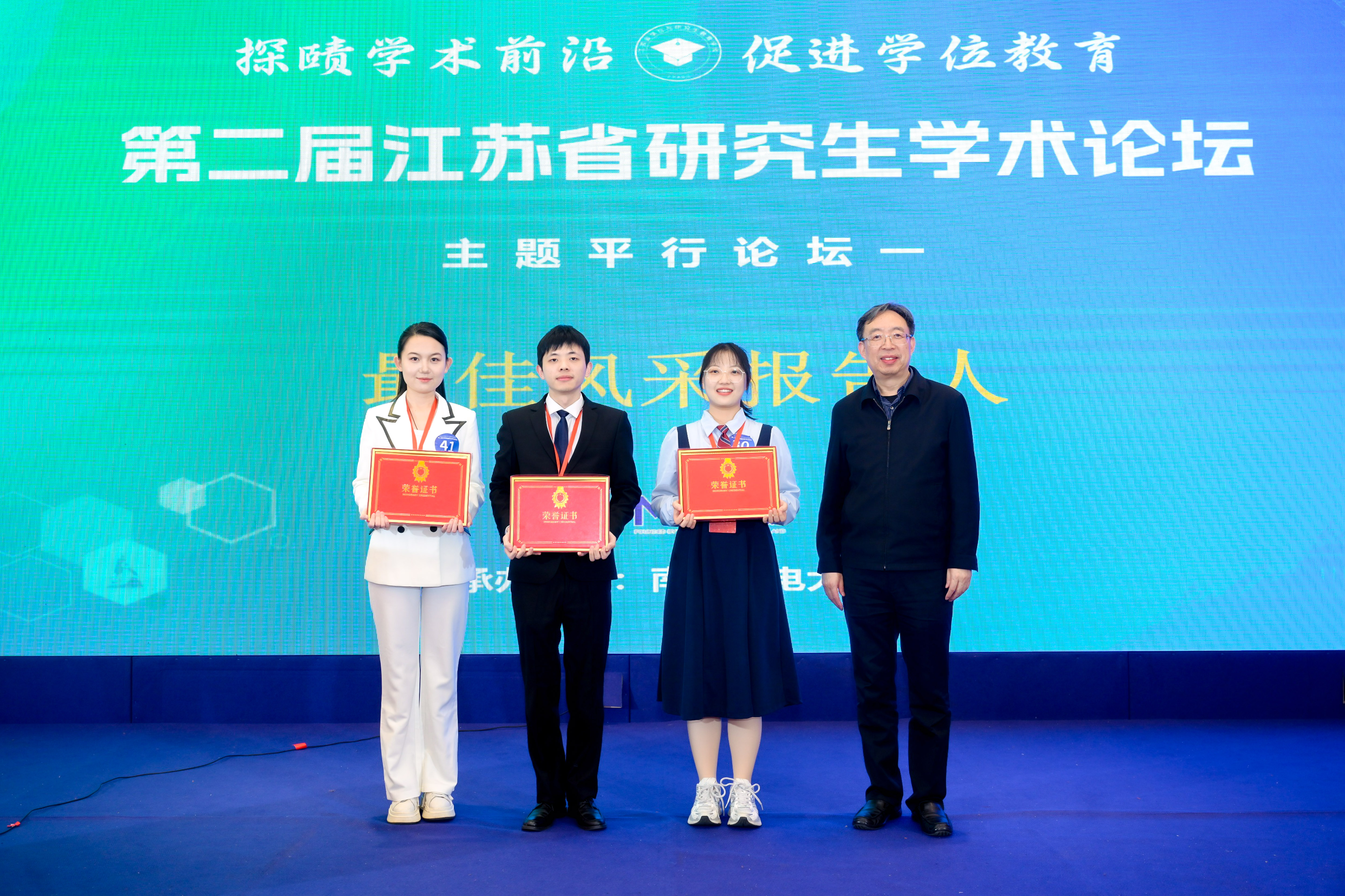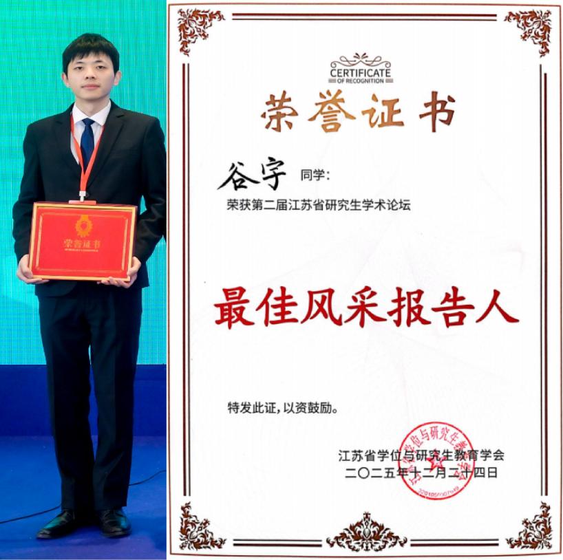 12月24日,第二届江苏省研究生学术论坛在南京成功举办。本届论坛在江苏省教育厅的指导下,由江苏省学位与研究生教育学会主办、南京邮电大学承办,引进了国际学术界通用的“三分钟论文演讲”(3MT)展示模式,强调在极短时间内清晰、生动地阐述科研工作的价值与发现,突出跨学科融合、科研普及与表达能力并重的指导思想。本届论坛由江苏省教育厅原厅长葛道凯、南京邮电大学副校长谢平等多位资深专家担任评委,av漫画 谷宇同学代表学校参加论坛并获评“最佳风采报告人”和“优秀学术报告”奖,江苏省教育厅原厅长葛道凯为谷宇同学颁发奖项。