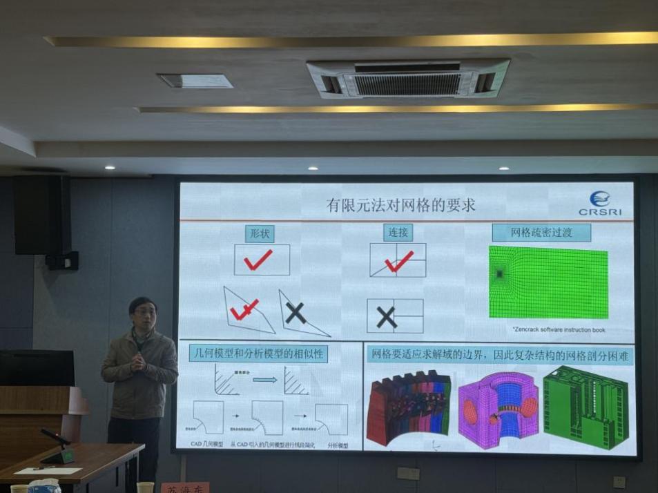 长江科学院苏海东教授应邀做了题为“偏微分方程自动计算研究进展”的主题报告。他介绍了以CAD与CAE融合为目标的独立覆盖流形法,结合工程案例展示该方法的优越性,并从误差控制、均衡细分、后处理等方面展望了未来研究方向。