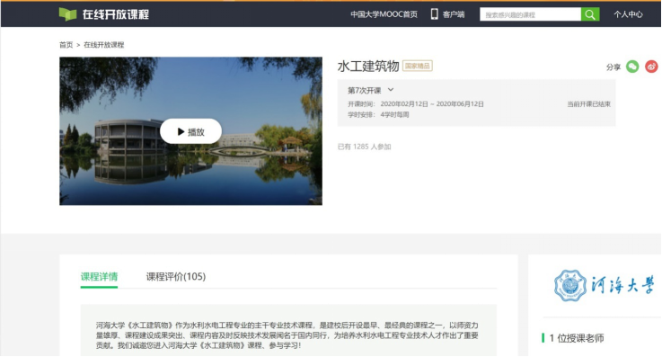 Course "Walking into Water Conservancy" is a publicly selected course of Hohai University. It introduces the scope and connotation of water conservancy and water conservancy education with rich examples and brilliant pictures and texts, describes the development history and outstanding achievements of water conservancy, and explains the work contents and responsibilities water conservancy workers ought to shoulder, showing the severe challenges and broad prospects which water conservancy is facing.