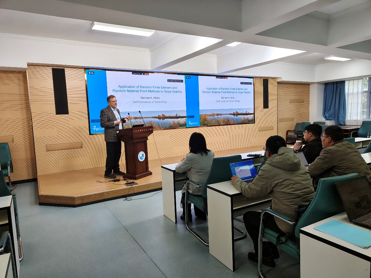 On the morning of December 8, 2025, Professor Michael Hicks, an authoritative expert in the field of international geotechnical engineering from Delft University of Technology in the Netherlands, was invited by Professor Wang Yuan to visit our university and delivered an academic lecture titled Application of the Random Finite Element and Random Material Point Methods to Slope Stability Assessments.